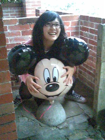 ㄜ~帶著這個米老鼠汽球真的很累贅,可是!我們這群沒良心的傢伙在吃飯時,跑去買了假蟑螂嚇她,所以~爲了補償她,只好讓她買了。