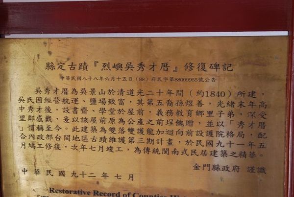 | 烈嶼吳秀才厝位於上庫村,是清末秀才吳文長的故居,地方上習稱之為「秀才屠」。昔日列嶼的陵水湖一帶,也是金門的鹽田之一,當時的鹽田係屬私產,吳家正是從事鹽的買賣,將當地所產的鹽運銷中國內地。經商致富後的吳家,既樂於鄉里問的公益善舉,又不忘子弟課讀之業。近代以來,士庫村人讀書風氣大開,人才輩出,蔚為一個文化背景雄厚的聚落,吳秀才開風氣之功不可沒。 |