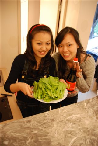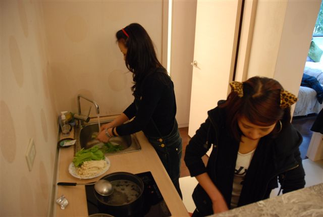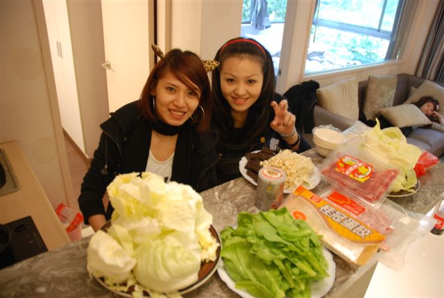 而怡綾、小羽和呆呆開始動手準備晚上要吃的火鍋料和湯頭。(好賢慧唷)