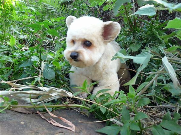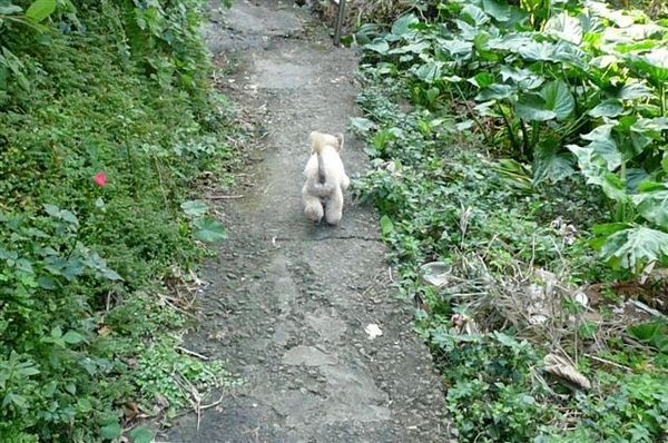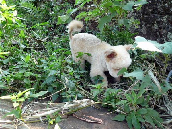 當他鑽進草叢時,心情好像好了一點點,開始東聞聞西嗅嗅。有養狗的人應該都知道他想幹什麼吧!