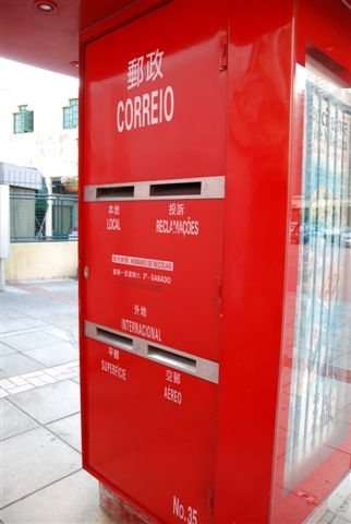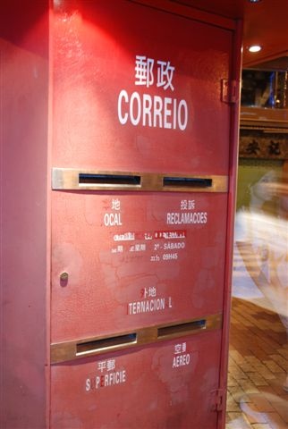 抵達澳門的第一天,我們晚上在政府總部那等著看音樂噴泉,意外的看到了一個褪色的郵筒。